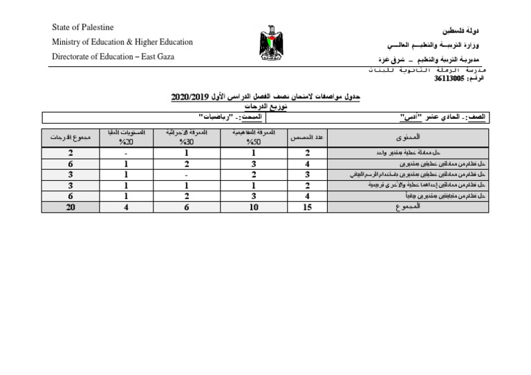 جدول المواصفات وزارة التربية والتعليم