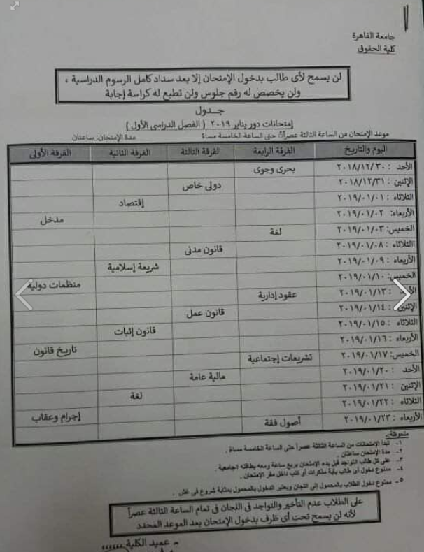 جدول امتحان دور يناير 2020 شباب وبنات كلية حقوق القاهره Facebook