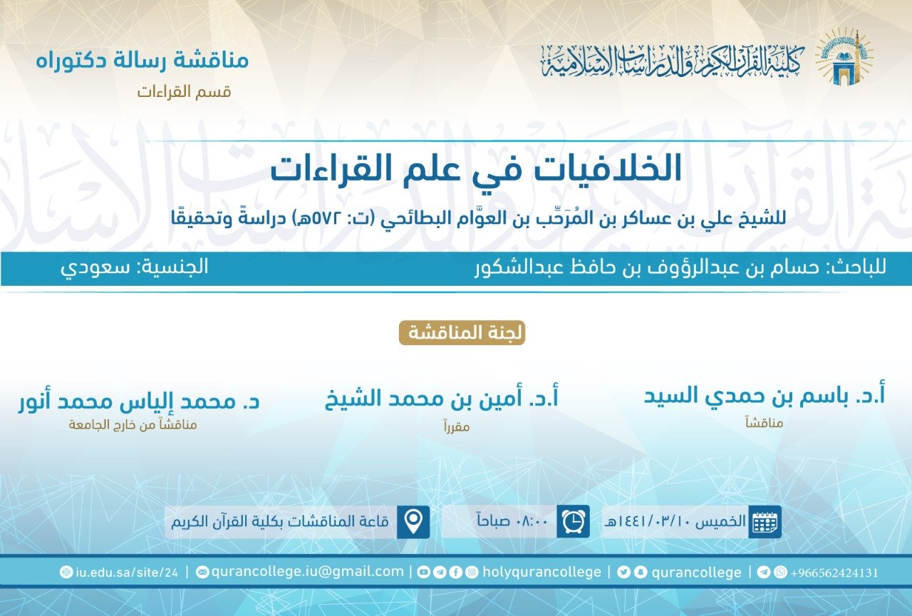 كلية القرآن الكريم On Twitter دعوة لحضور مناقشة رسالة دكتوراه الخلافيات في علم القراءات للشيخ علي بن عساكر بن الم ر ح ب بن العو ام البطائحي ت 572هـ دراسة وتحقيقا للباحث